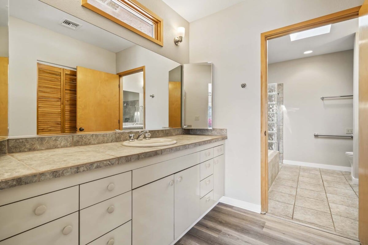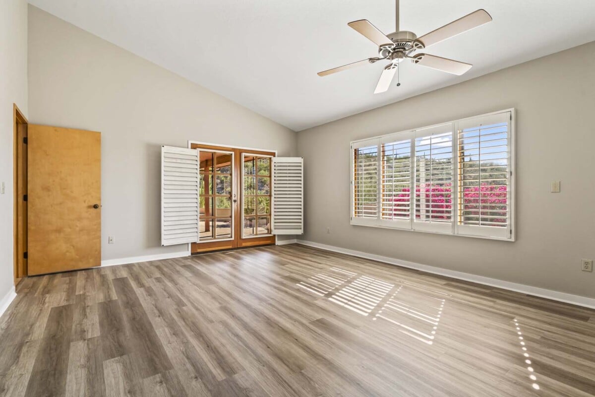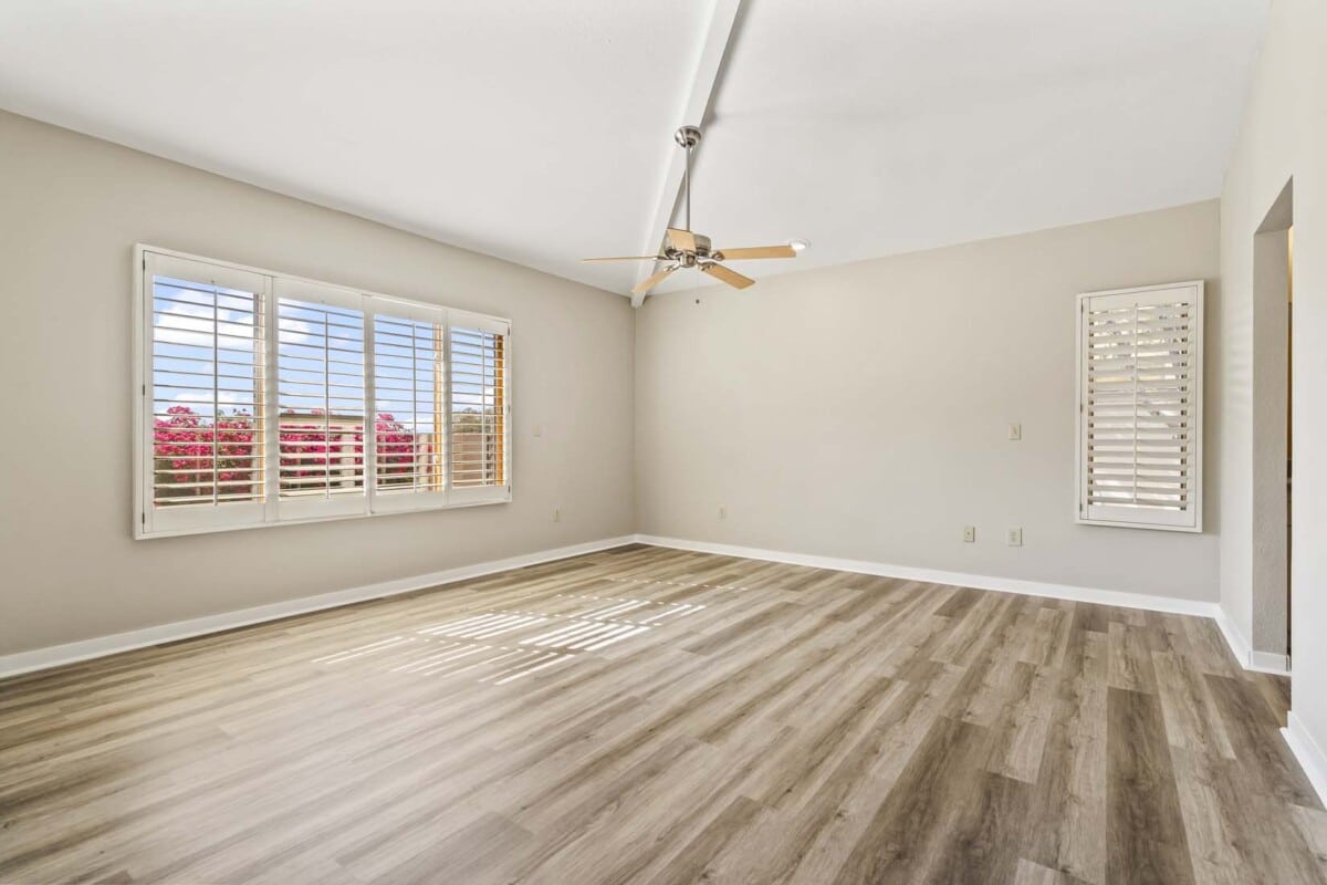 Excellent opportunity in the luxury, gated/guarded community of Finisterra; Enter through the welcoming foyer into the light-filled living room featuring cathedral-pitched ceilings, walls of windows with custom shutters, a fireplace & built-in bookshelves, and opening to the formal dining. Cheerful kitchen w/bar seating & breakfast nook, spacious owners suite, two guest bedrooms & a bonus room with closet that can also serve as an additional bedroom or delightful home office or den.